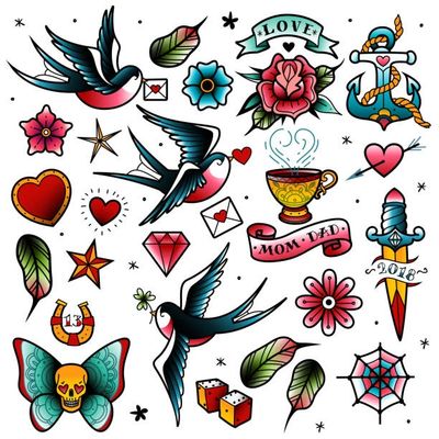 Swallow A maritime emblem, swallows mark a sailor’s voyages—one for 5,000 nautical miles, another at 10,000. Known for their epic migrations, they symbolize freedom, loyalty, and safe return, with pairs reflecting partnership. Sailors believed swallows guided souls to the afterlife if lost at sea. Often placed on the chest or hands, their outward orientation showcases hard-earned pride.